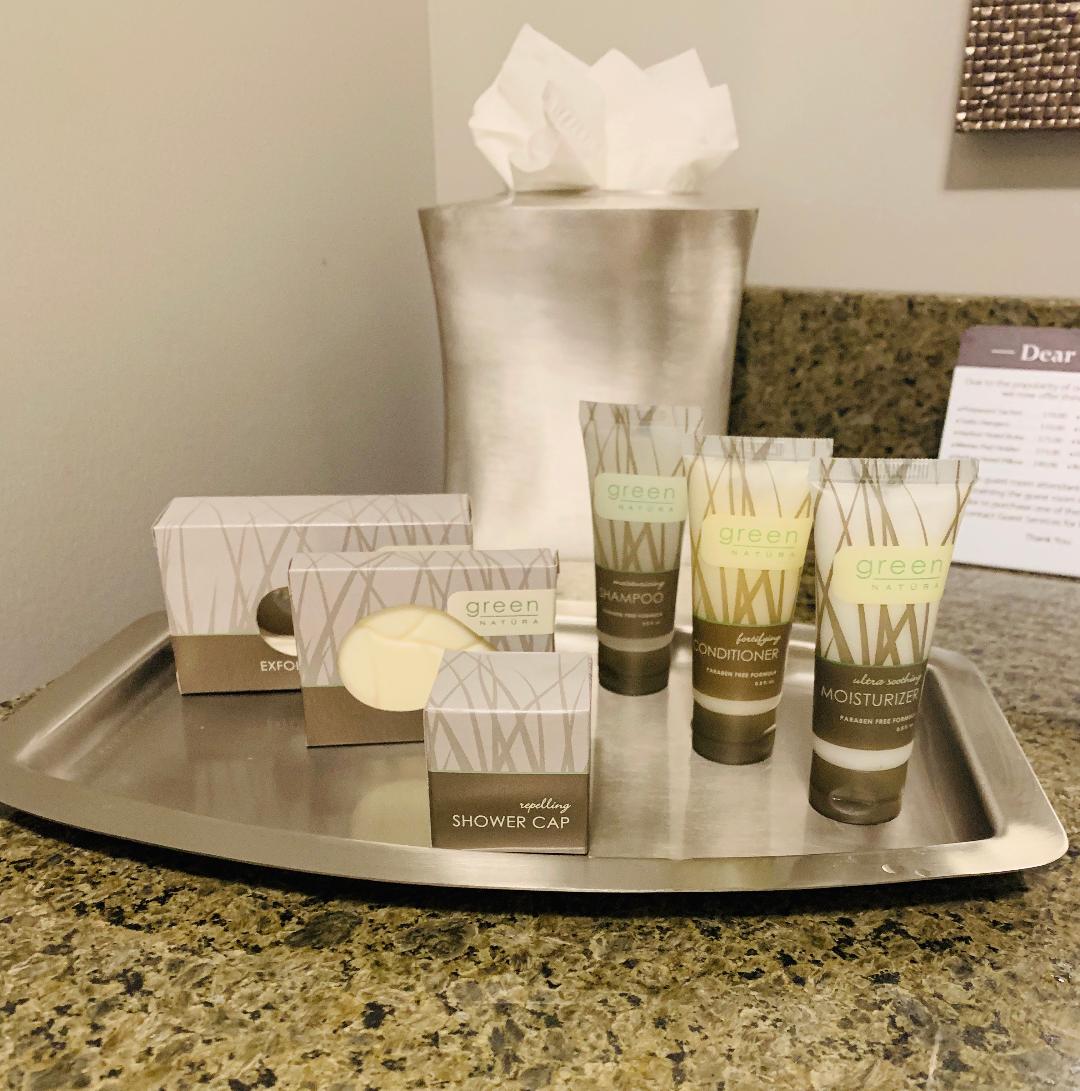 Amenities: The amenities at this hotel were all first class. There is an indoor and outdoor pool, large fitness center with plenty of weights and machines, a putting green, onsite dining, fire pits and a bar outside by the lake, and plenty of chairs to enjoy the lake view. In addition, the room had very nice toiletries, and there was coffee station on every floor. In our opinion, the only thing it was missing was a hotel shop. We love to be able to get a small souvenir of our stay at a place like this.