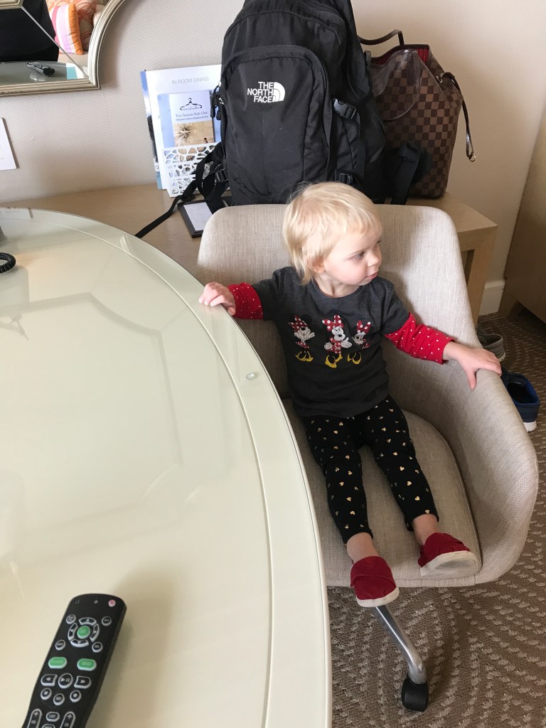Rebekah’s other favorite part of the room is the large curtain that can be used to separate the living/kids space from the main bed. It was a large and heavy curtain so it felt like a nice divider. This was especially helpful for things like early bedtime. The lighting is separate on both sides of the curtain so it can be dark on one side and light on the other. Also, the TV swings around so it can be on and seen in either the kids side or the main bed side. This was another nicety for early bedtime. We felt like we could watch TV after Rosie went to bed and the light from the TV wasn’t bothering her. With her noisemaker going at night it wasn’t quite like having her own room, but almost.