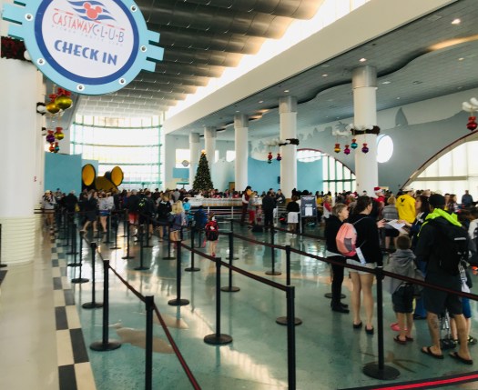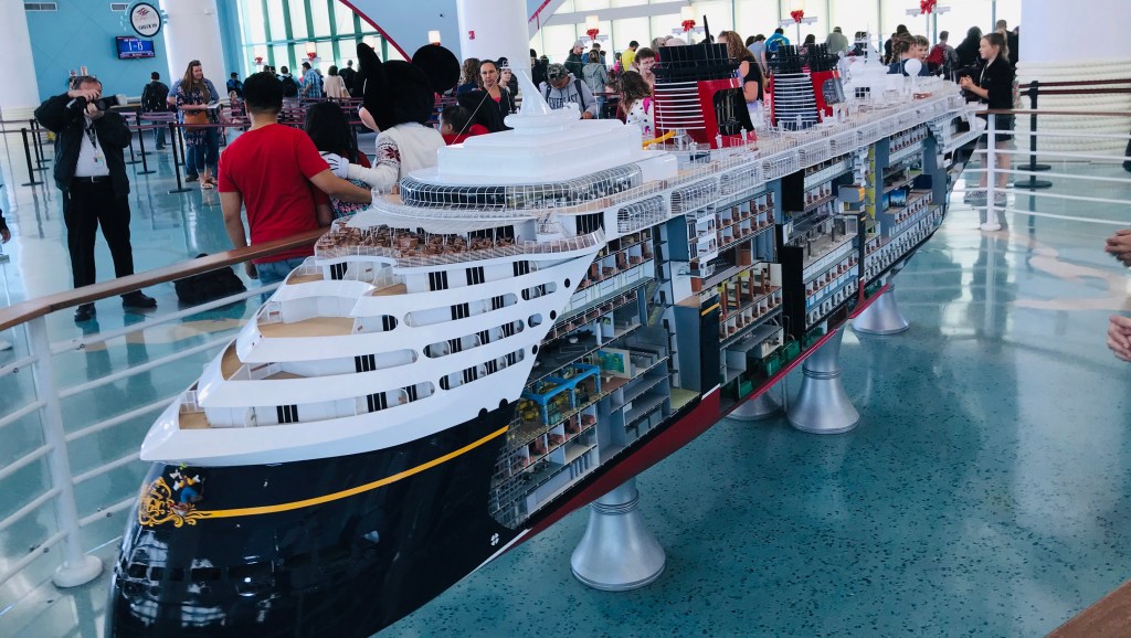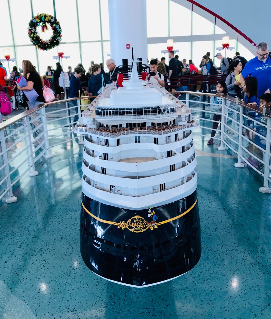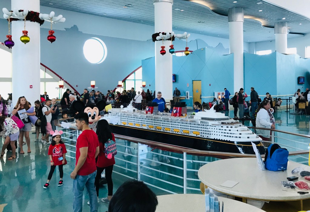 Cruise ship terminals are different depending upon the cruise line and the location. Some cruise terminals are boring with no decorations and some are themed to the location or the cruise line. Disney’s terminal did not disappoint. The Disney magic was evident everywhere. There is a really cool ship model in the terminal which is super cool to look at because it is open on one side with teeny models of what is inside the ship. Even cooler is that Mickey is also there and you can get a picture with him. As you head to board the ship you walk through a Mickey shaped arch way.