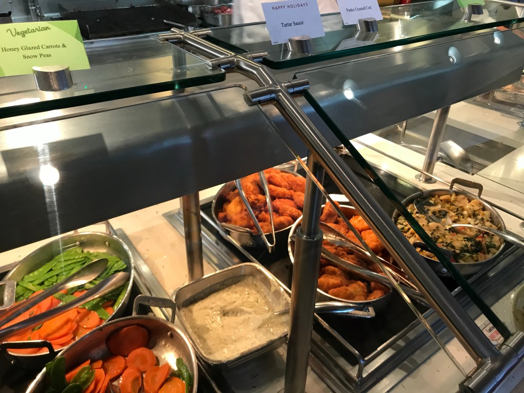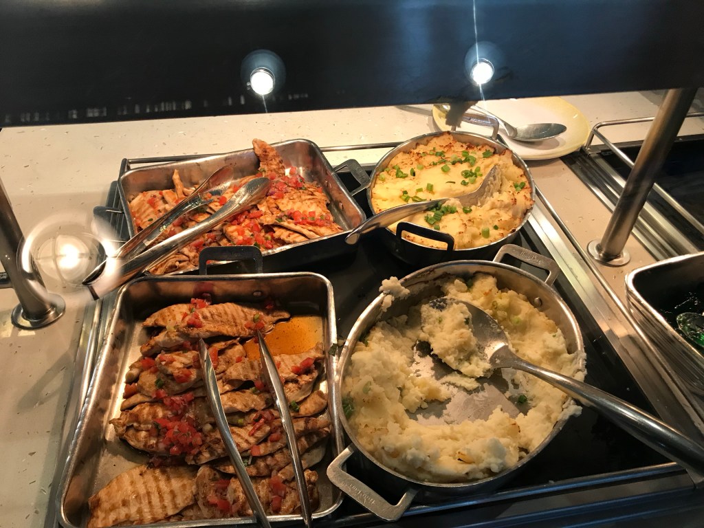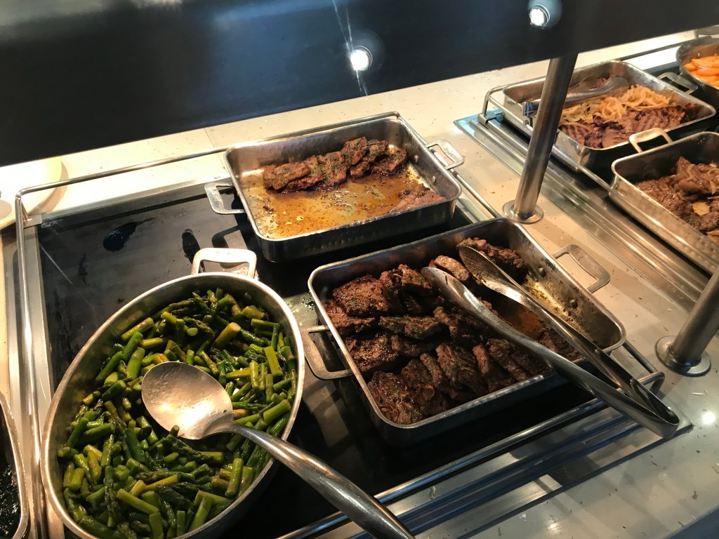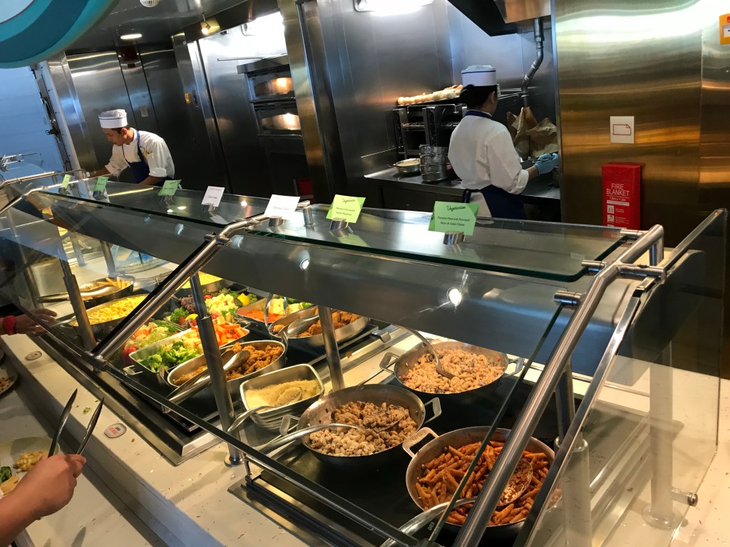 Neither of us liked the set -up of the buffet. It is in a horseshoe shape with the same food on both sides. It was similar to the Carnival Breeze and can allow for longer wait times and lots of congestion. We prefer spaced out stations like on NCL Jewel class ships, this allows for much less congestion. There are two main doors in and out of the buffet, however there was door that always locked. This caused backups both ways going in and out of the buffet. Lastly, the buffet hours felt limited relative to other cruise lines. This was frustrating when trying to get an afternoon or evening snack. There is an outdoor grill area by the pool with pizza, hot dogs, etc but it is not always open either (12-3:30 and 4:30-6).