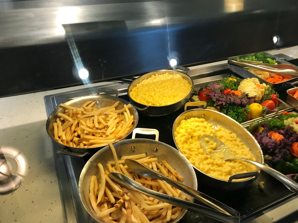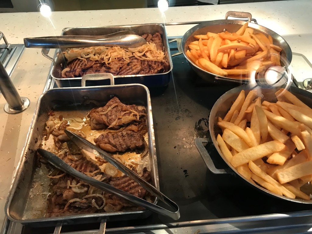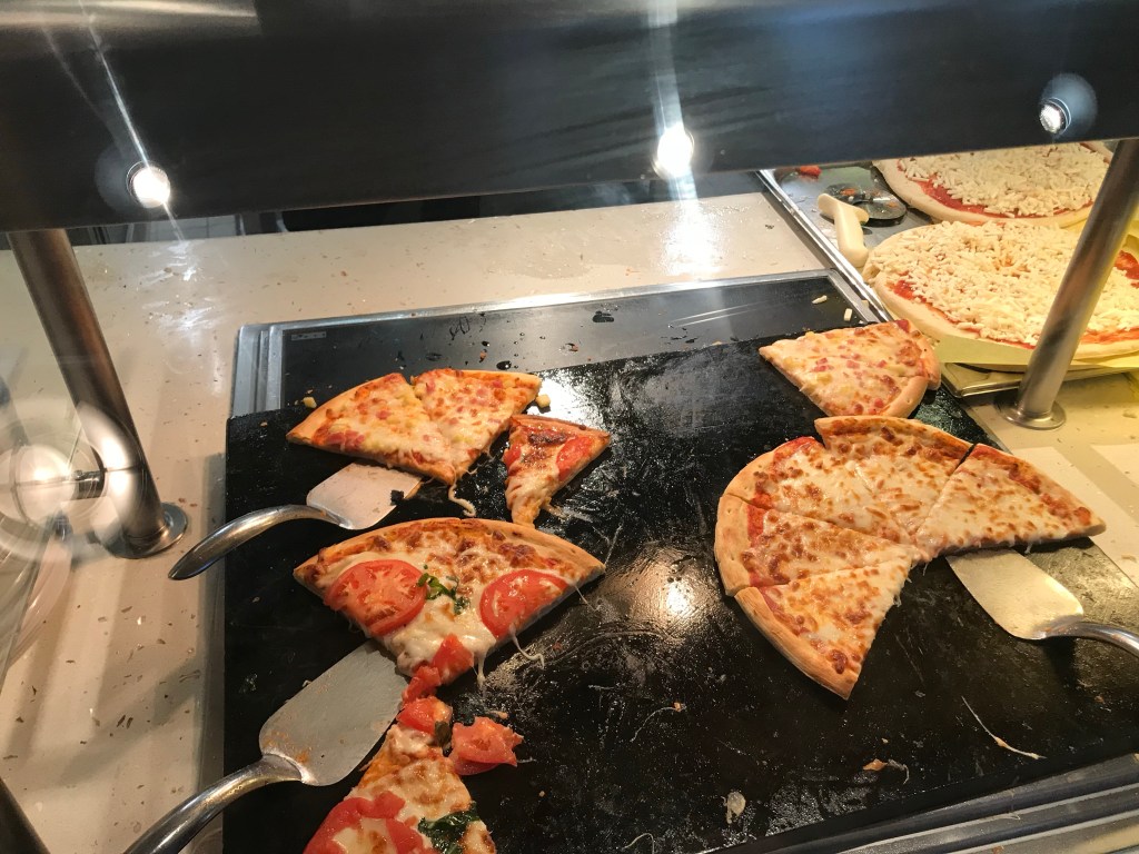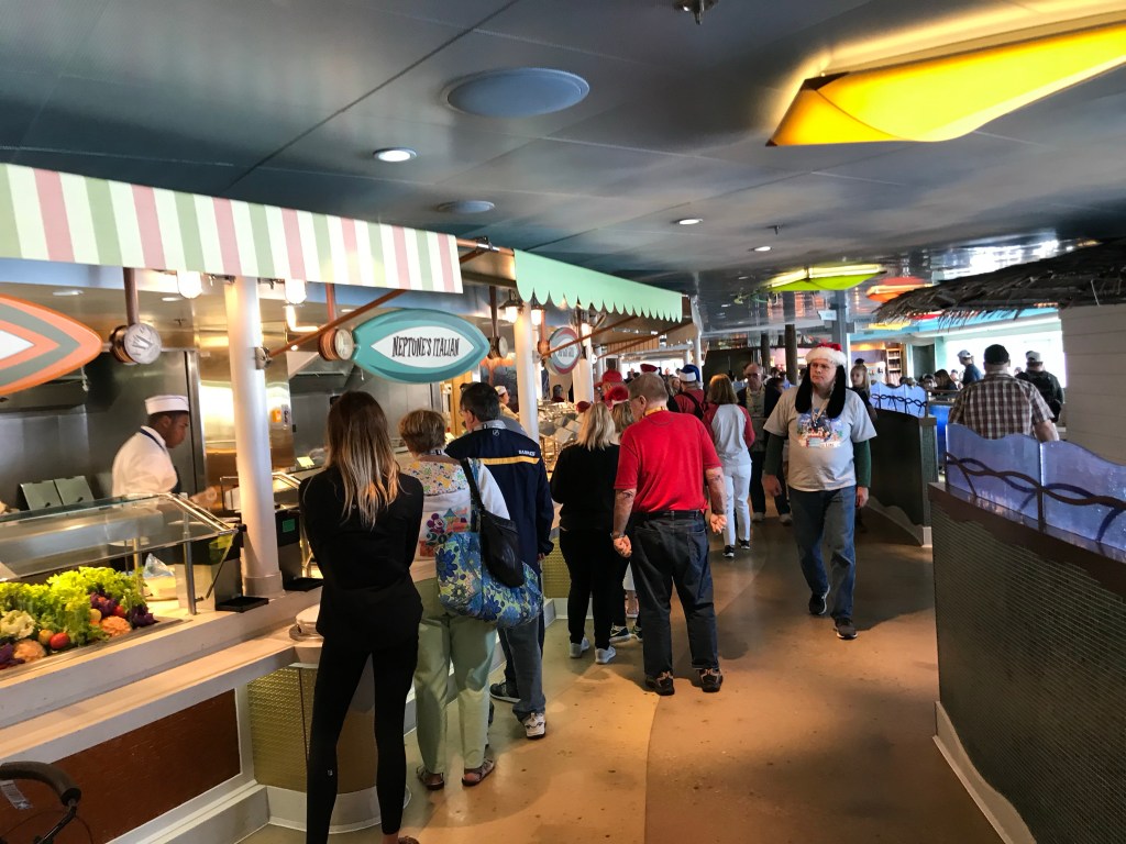 Neither of us liked the set -up of the buffet. It is in a horseshoe shape with the same food on both sides. It was similar to the Carnival Breeze and can allow for longer wait times and lots of congestion. We prefer spaced out stations like on NCL Jewel class ships, this allows for much less congestion. There are two main doors in and out of the buffet, however there was door that always locked. This caused backups both ways going in and out of the buffet. Lastly, the buffet hours felt limited relative to other cruise lines. This was frustrating when trying to get an afternoon or evening snack. There is an outdoor grill area by the pool with pizza, hot dogs, etc but it is not always open either (12-3:30 and 4:30-6).
