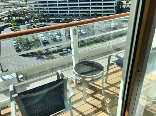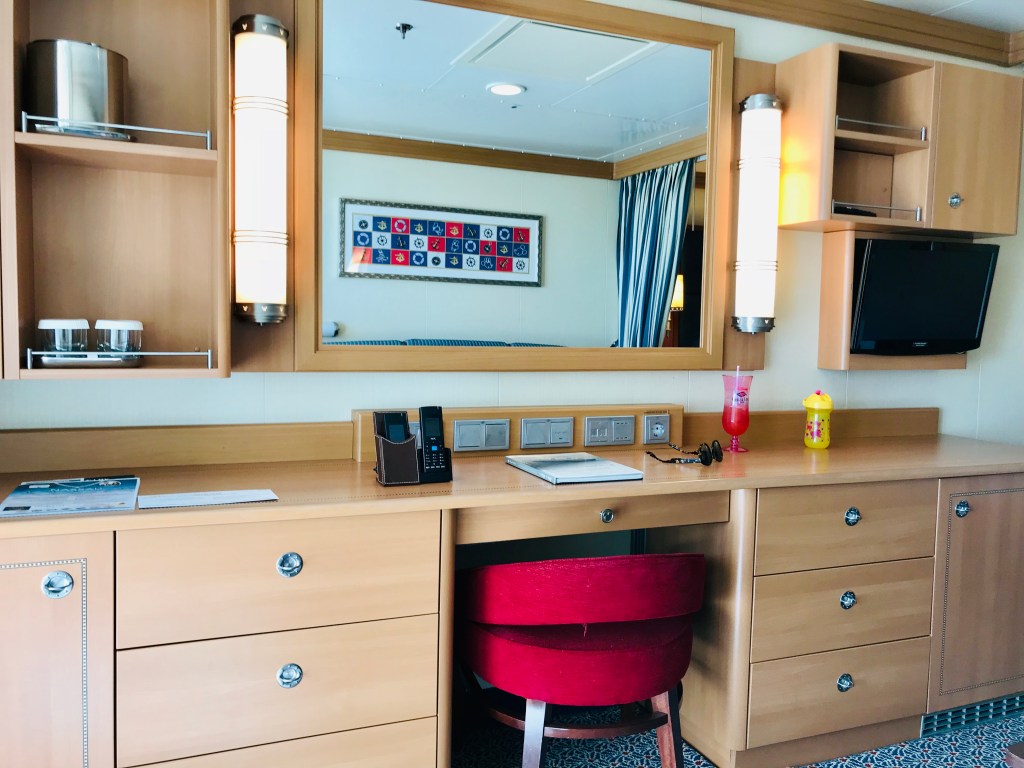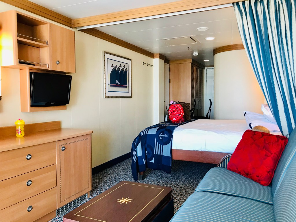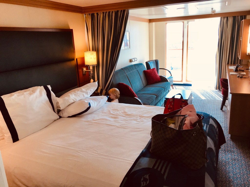After a fun but chaotic embarkation lunch we headed to check out our cabin: a family veranda room. The room was a very large for a cruise ship room, there was more than enough room for the 3 of us. As you entered the room the bathrooms are both right by the door. The main bed is soon after the bathrooms with a living space/nighttime beds. After that is the balcony door.