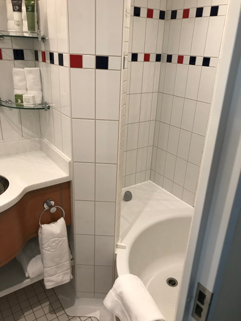 Like most family travelers we loved the bathroom set-up! DCL splits the bathroom into two parts. One has a toilet and sink while the other has a shower/tub and sink. The split orientation is super helpful because if you have a family then someone can be toileting privately while another person can be showering/bathing privately. The bathtub is a rarity on other cruiselines and is standard on DCL. A huge bonus for people needing to give a toddler a bath.