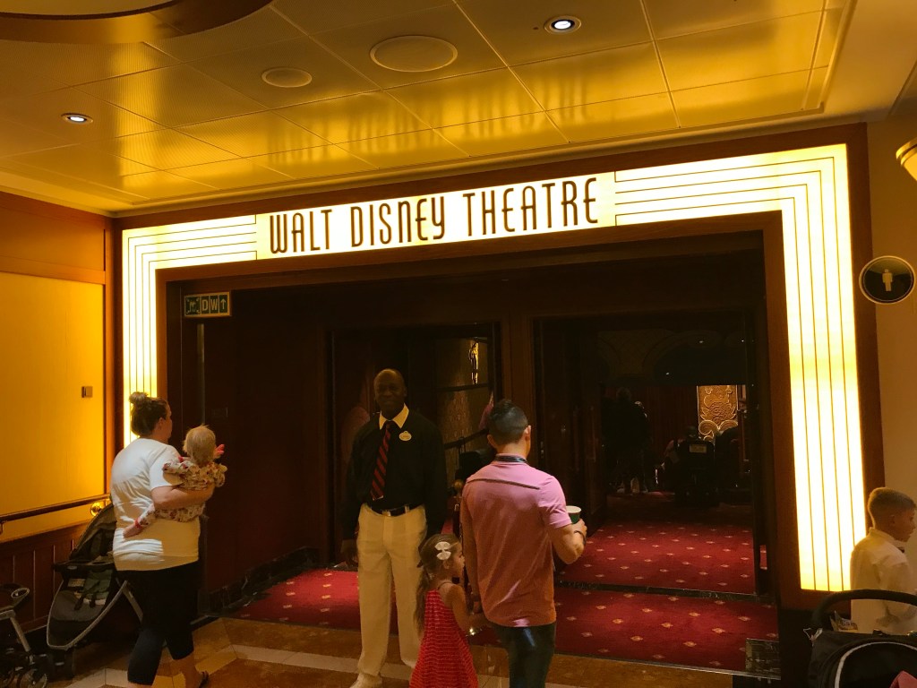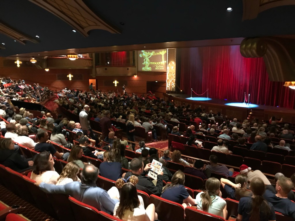 The assigned dining times are scheduled to coordinate with a nightly entertainment. The show on the first night was titled, “The Golden Mickeys”. It was an awards type show that featured many classic songs from Disney movies. Unsurprisingly, it had all the Disney magic and the performance was really good. The theater was nice with ample seating on the on the 3rd and 4th floor. One of Ben’s favorite things about the show was the concession areas right before you come into the theater. You can purchase popcorn, candy, beer, wine, bottled water, etc.