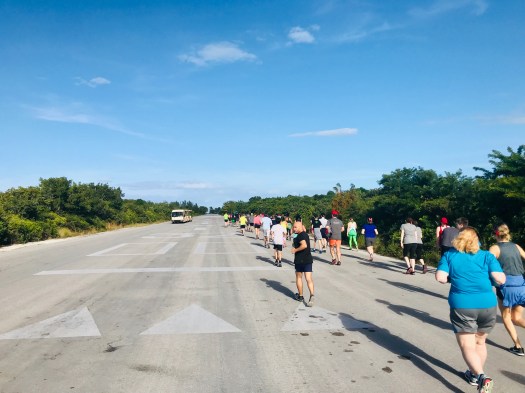 The race starts in a cluster of buildings/stores. From there you follow a road that zigs and zags until you take a left on the airplane runway. You will continue down the runway until you take a right at the water station as you enter the “loop of doom.” As you circle around this loop you will pass different things such as anchors and buoys that have been placed on the island. As you exit the loop you again pass the water station and continue down the runway until you reach the beach. At this point you turn around and follow the same route back to the start/finish line.