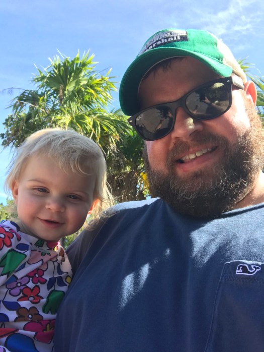 After getting cleaned up we headed to find a seat on the beach. I was worried that it was going to be impossible to find a good chair on the beach because we were so late getting out there due to the race. We were wrong, there were a TON of empty chairs all up and down the beach. We rode a shuttle that took you from the dock to the beach, it was nice to have a break from walking after the morning run. We got settled in our spot and went down to the water to play. Rosie was not having it in the sand today, she wanted to stay up on the chair for some reason…haha.