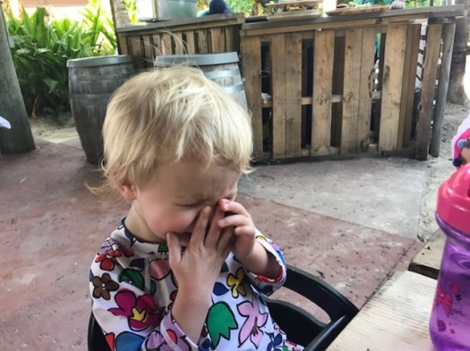 After the magic show it was back to the main deck for the Pirates of the Caribbean show. This show also features singing and dancing as well as an appearance by Jack Sparrow. It was after Rosie’s bedtime, but we really wanted to see it so we put her in the Ergo carrier and headed up. The show was amazing and concluded with a fireworks show. All in all in was very impressive.
