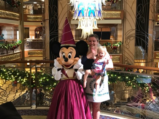 After the lunch at Remy we picked up our daughter from the nursery and went to get pictures with Mickie and Minnie. One of our favorite things about the cruise was the ample times available to meet characters. The times were published in the daily newsletter you get in your stateroom. The lines were almost always short to wait to meet the characters and it felt like you had ample time to visit with them. Another added bonus was the characters often wore cruise-specific costumes which you would not get at WDW. If you have a character loving child this an especially important part of the cruise. After we met the characters we decided to finish packing before enjoying the ship prior to dinner.