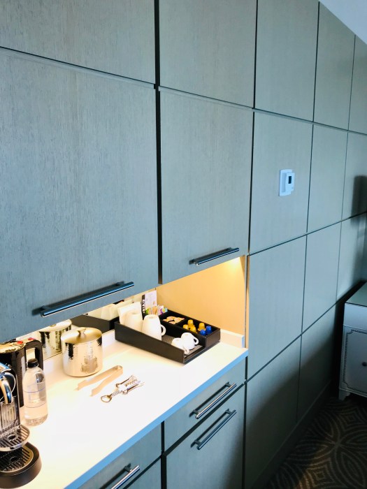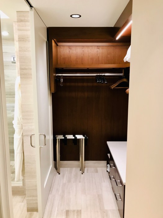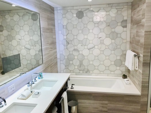 Soon after we got up to the room, the bellman who had met us at the car was there to deliver our luggage. There was ample room and storage for all of our luggage. There was an open closet space in the area between the bathroom and the main room with luggage racks and tons of hanging space. The bathroom was beautiful and spacious. We loved the feature with the Television in the mirror! Thankfully the A/C worked great in this room (you will see over time that this is a recurring issue…Ben’s most important feature in a hotel room haha).