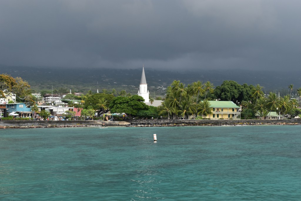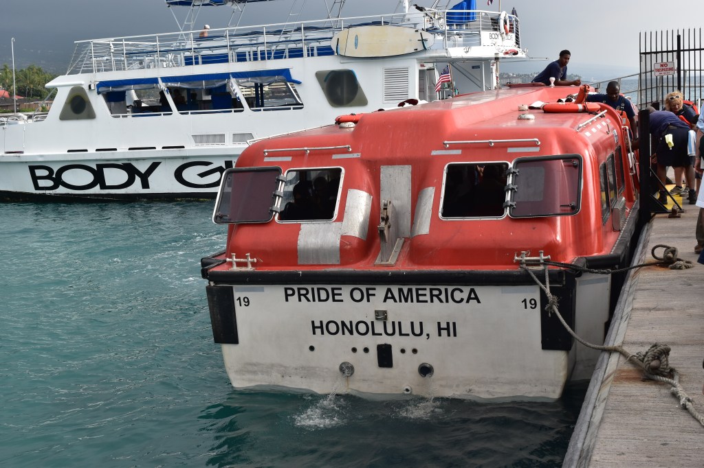 After passing the lava, the ship sails away to Kona. Kona is a tender port so that’s something to keep in mind when making your plans. What that means is the ship doesn’t pull up to a dock, it stops out in the water and you ride a smaller boat to the shore. On this cruise it was cool because we got to ride on the life boats as the tender. We have tendered in a few ports before but haven’t ever ridden the life boats so its always reassuring to know that the life boats can, in fact, be lowered to the water and they do work!