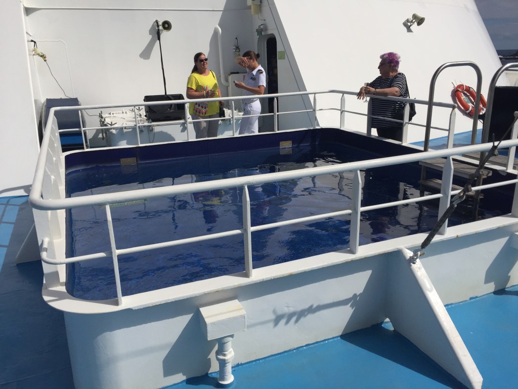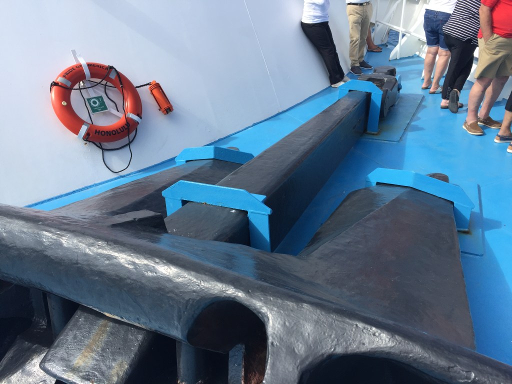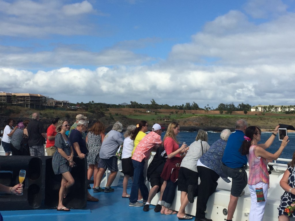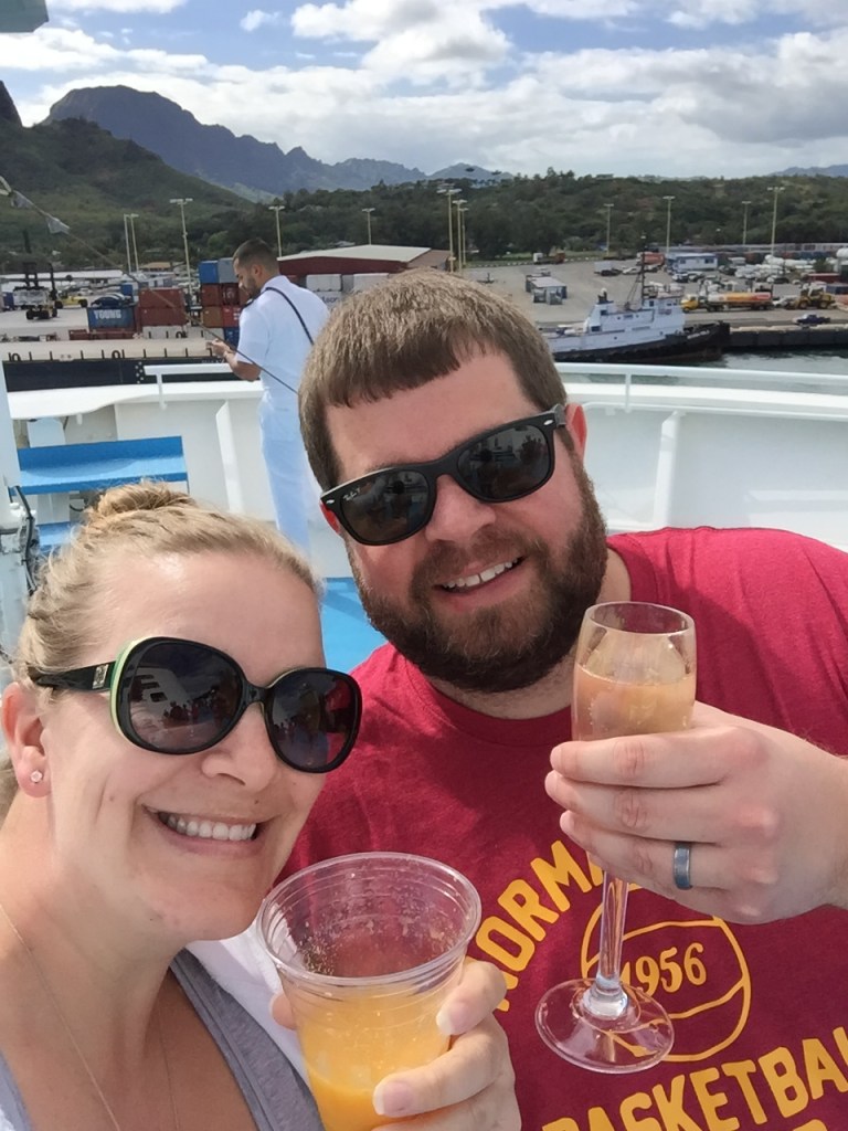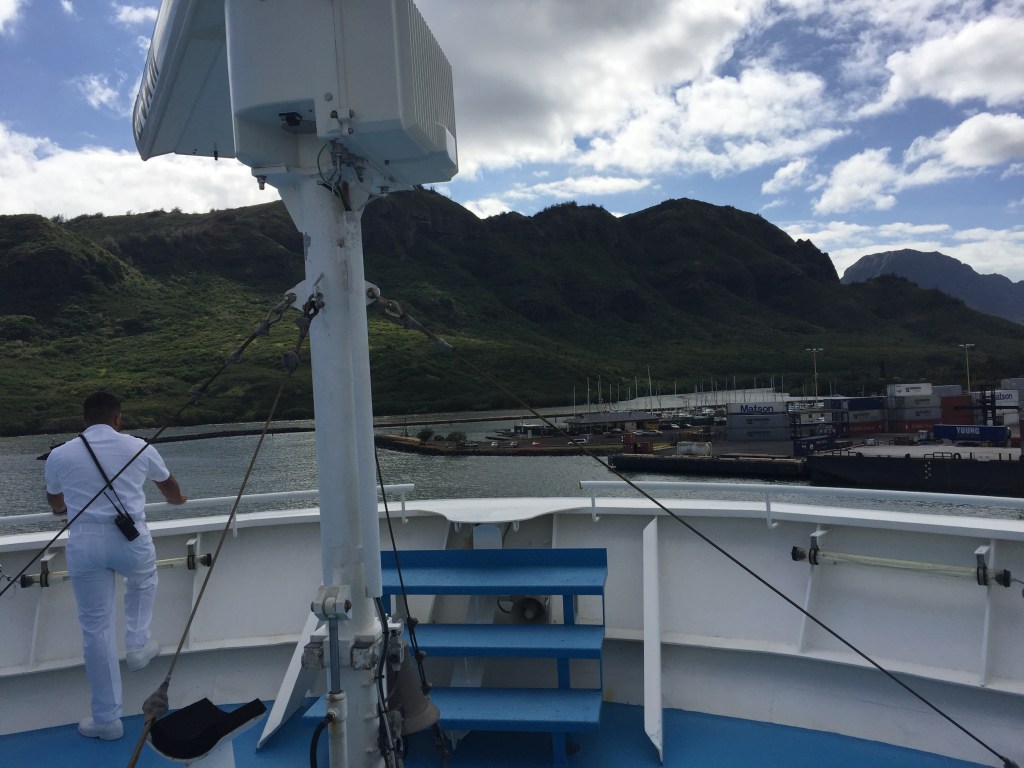 After lunch, we went to the room to get started on one of our least favorite ship activities: packing to go home. We like to get it done early so the rest of the afternoon and evening is free. It was especially important today because this afternoon we had plans. There was a latitudes event on the bow of the ship before the Napali coast line sail-by. This means it was a rare opportunity to experience sail-away from the very front of the ship!!