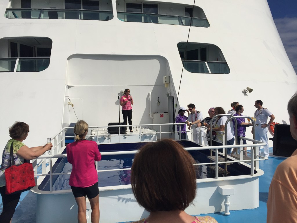 At the appointed time we grabbed our tickets (they do check these) and headed to the front of the ship. We have never been on the bow of the ship so we were pretty pumped. It was a nice party. Not too crowded and they had champagne and mimosas. I was able to get one of the servers to get me a cup of just orange juice…since my condition left me alcohol free 🙂