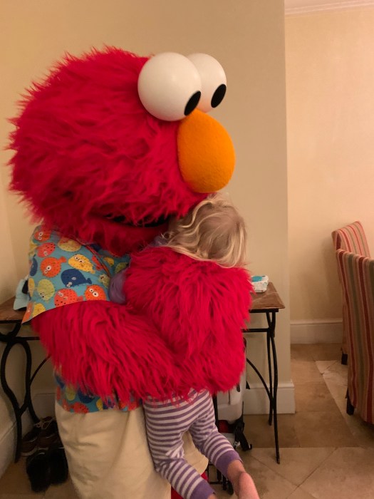 Elmo and his photographer and handler (Gigi) came into the room. He hugged Rosie and picked her up. We picked a spot for a bedtime story and Gigi read a bedtime story. Elmo then tucked Rosie in to her crib and we said our good-byes.