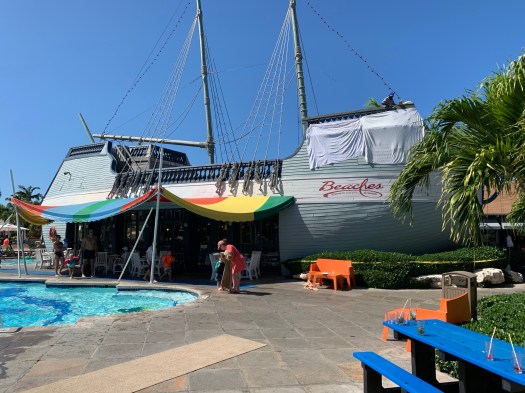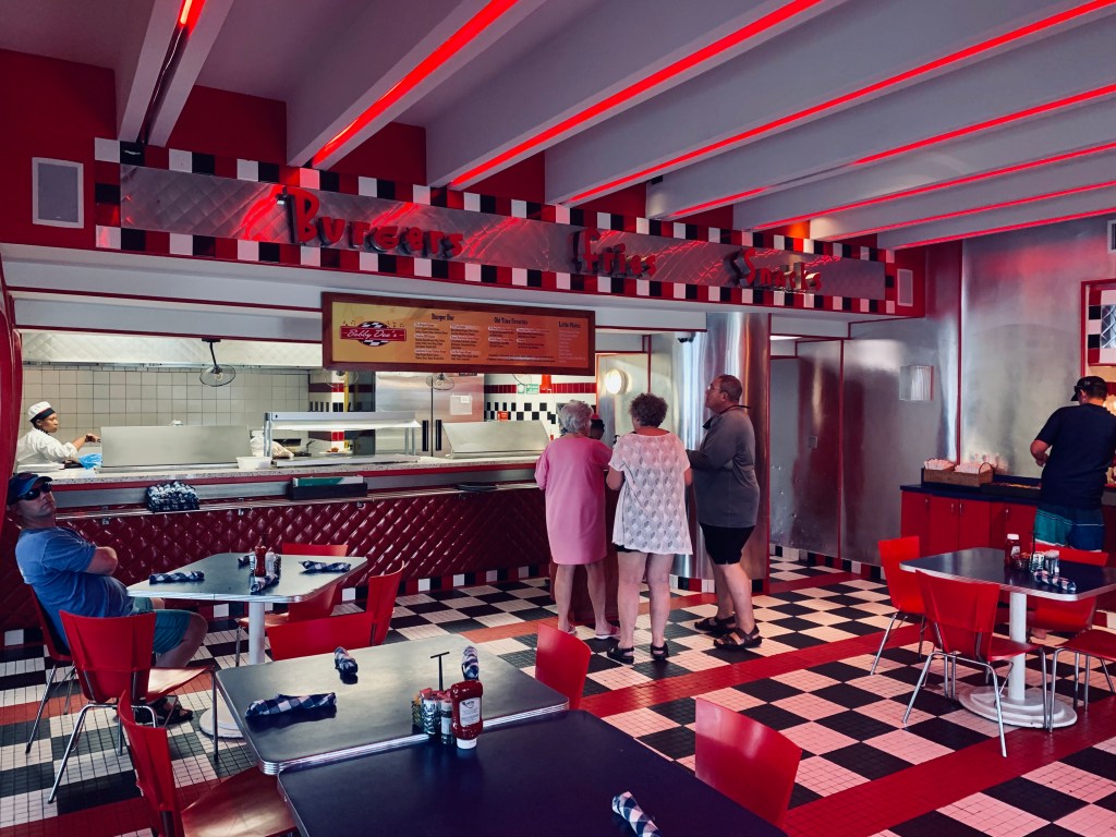 Have you ever wanted to eat ice cream in a Pirate Ship/1950s diner? You can do this and more at Bobby Dee’s! It is conveniently located in the water park. If you think the previously mentioned combo of pirate ship + diner is kinda strange, you are not alone. It looks like a full size pirate ship on the outside, but happens to be 50’s themed on the inside. Just go with it! There is an ice cream shop in the front and a restaurant in the back that serves traditional diner food like burgers, hot dogs, chicken wings, fries, and pizza. There also appears to be cotton candy and popcorn machines, but we didnt get to see them in action. While the food here was mostly average, it is convenient if you are needing a break from the water park!