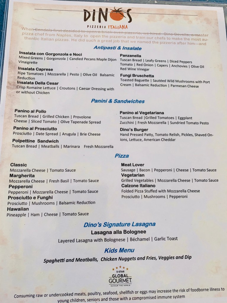 If you are in the mood for pizza and pasta, Dino’s is the place you want to go. We ate lunch here one day and then because the pizza was excellent, we picked it up for a snack another day. The restaurant is located in an outside courtyard in the Italian Village. It was not a “quick bite” kind of a place per se, as the pizza was made to order and it took a little while to bring out.